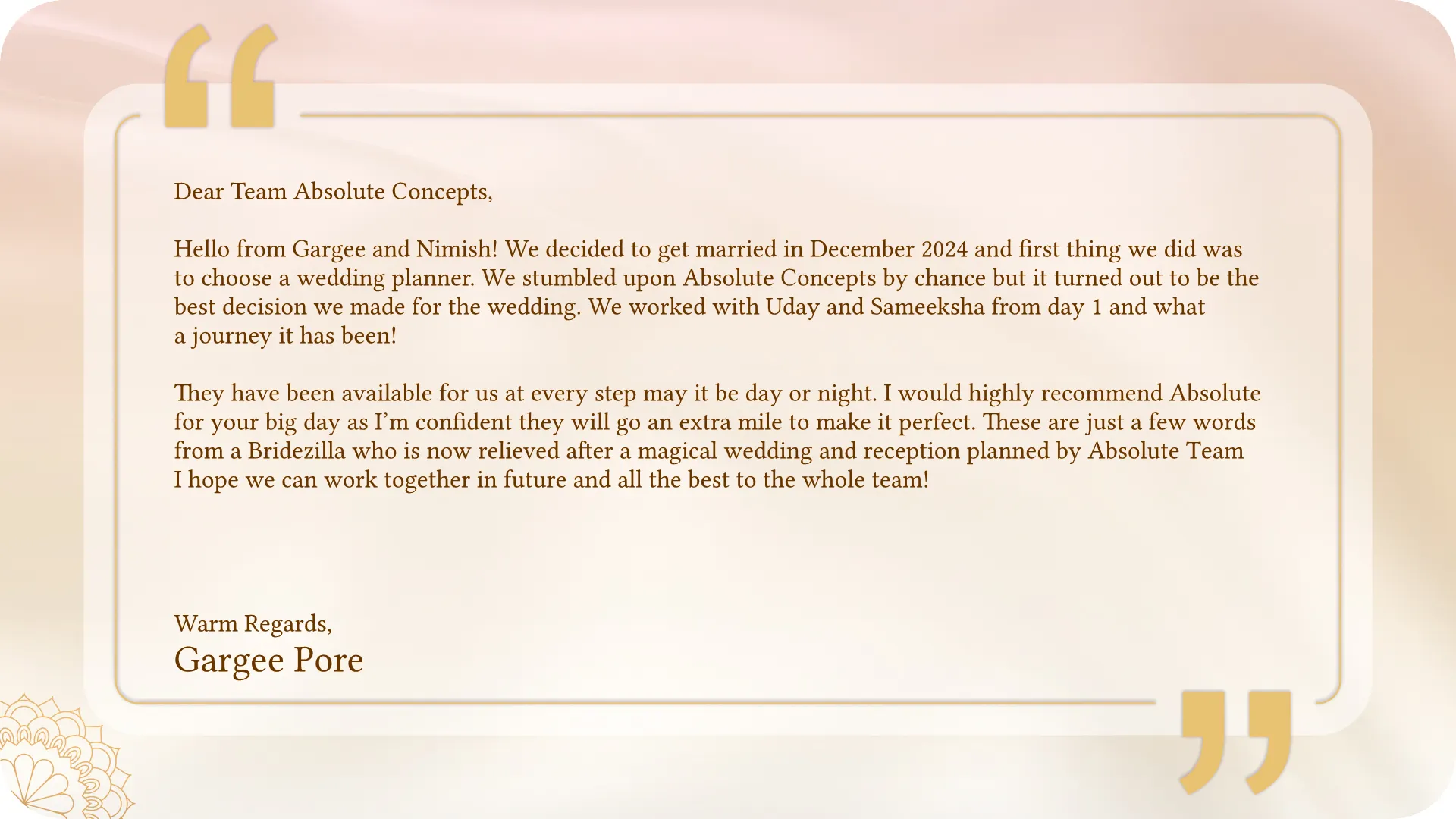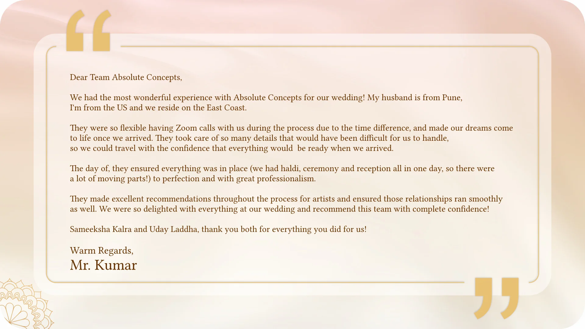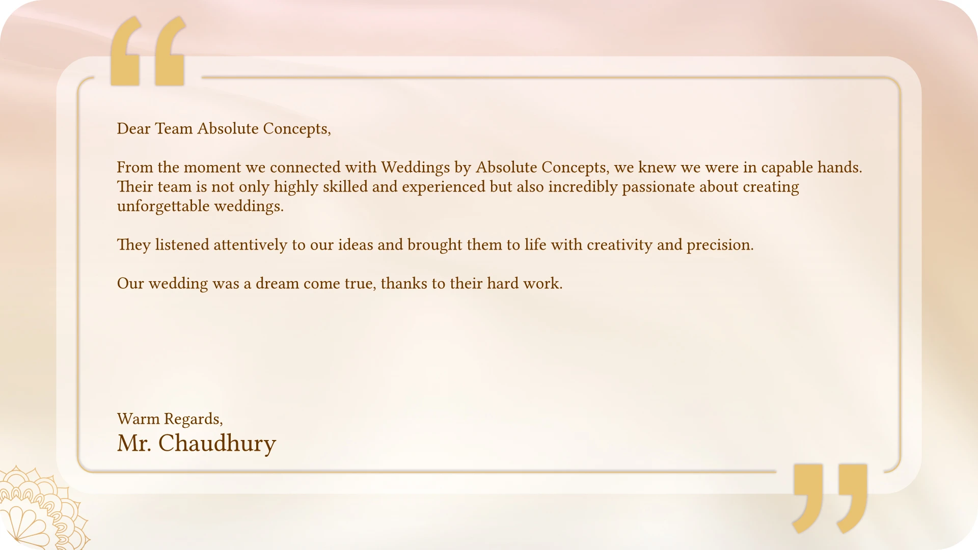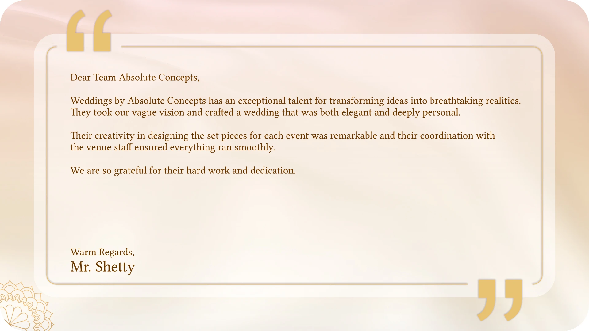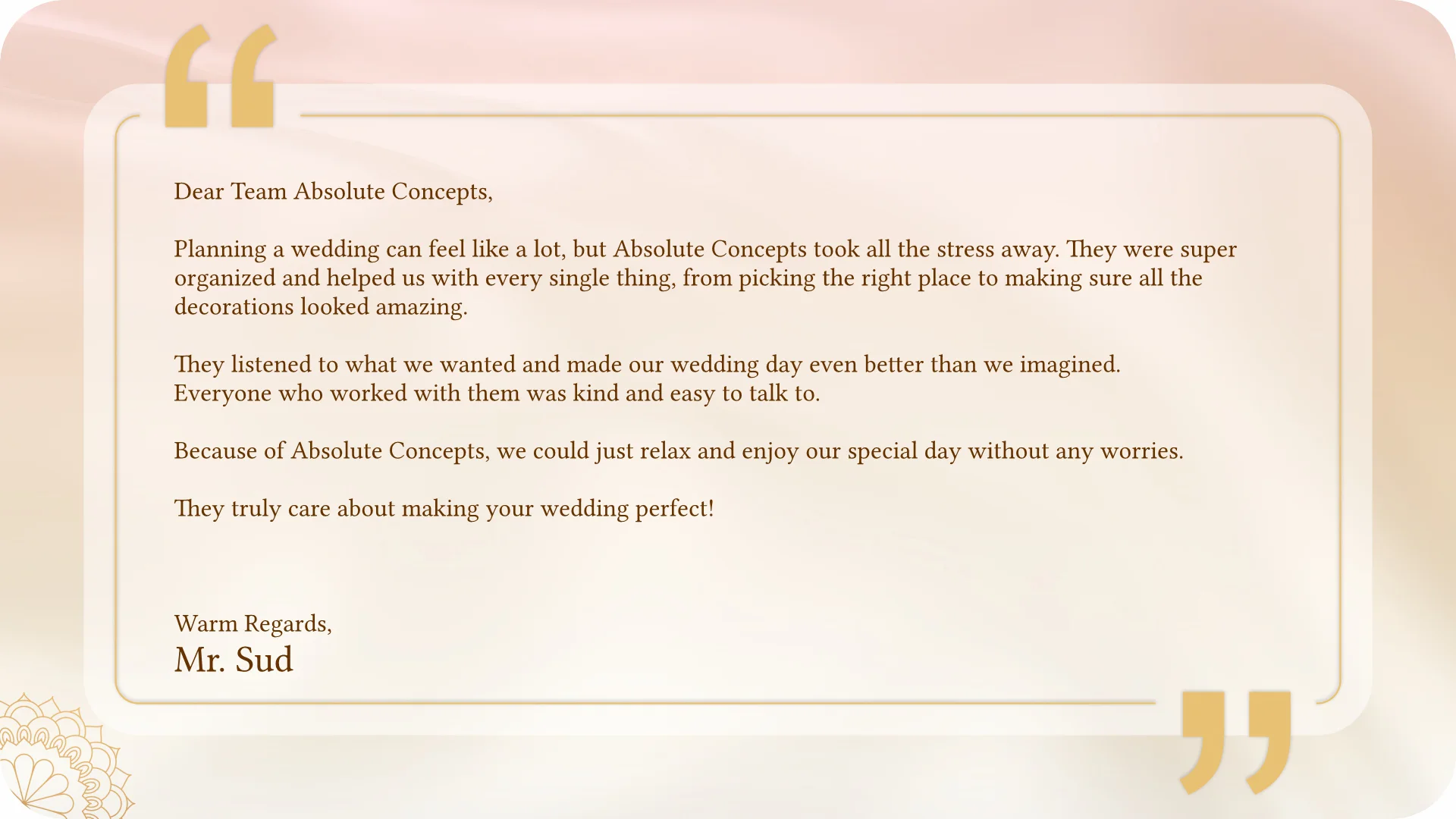 From personalized touches to complete design solutions, we help you create a wedding that perfectly reflects your style and love story.