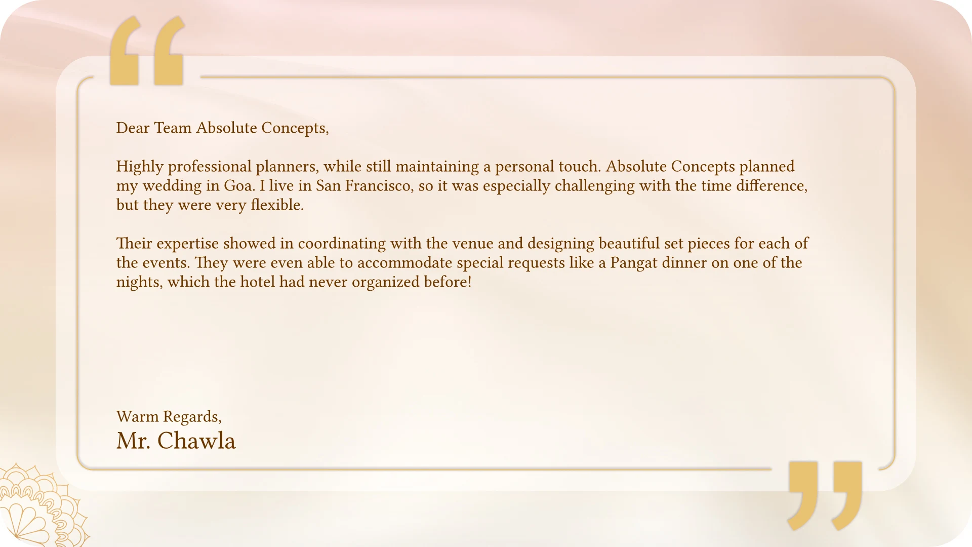 Connect with our expert wedding planning team and start your journey toward an unforgettable celebration. Whether it’s a grand cultural wedding, a luxury destination affair or an intimate traditional ceremony, we’re here to bring your vision to life with personalized planning, stunning décor and seamless execution. Let’s create timeless memories rooted in love, tradition and elegance. Contact us today and let the wedding magic begin!